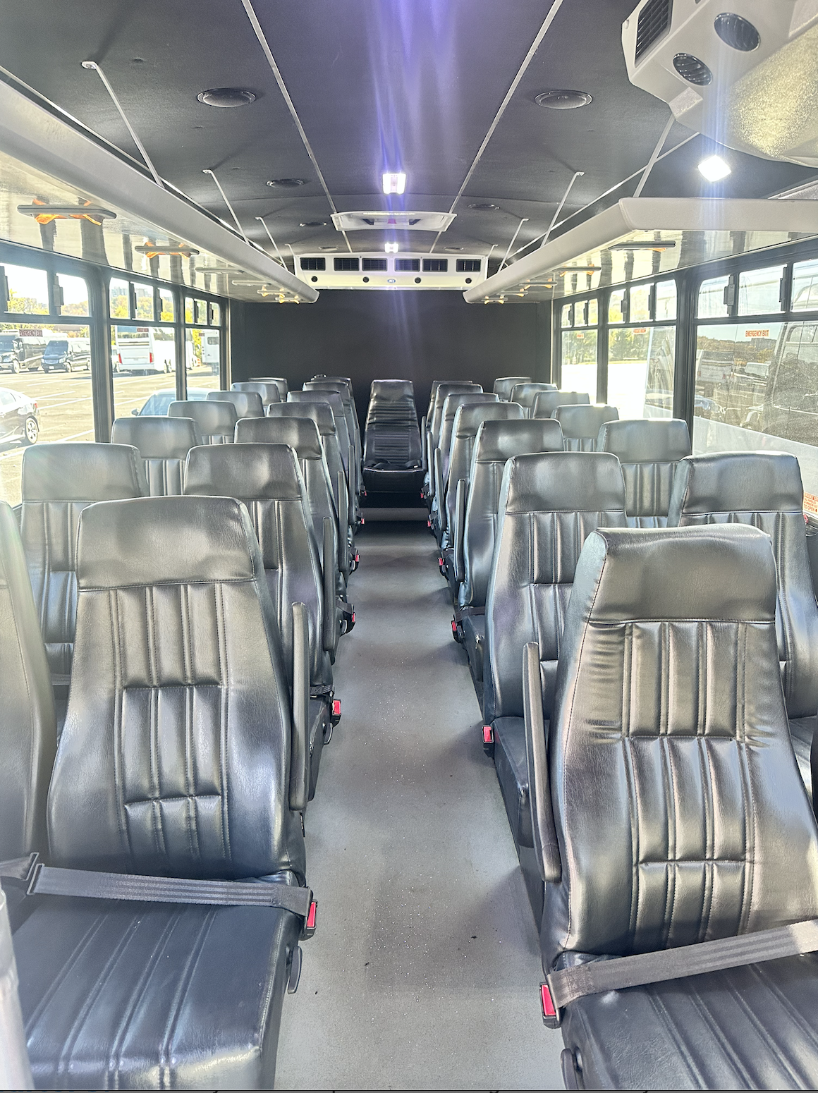 A black 29-passenger executive-style mini bus with leather seats and storage.
